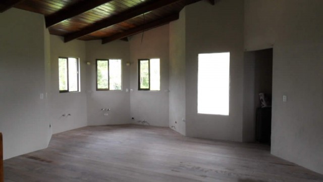 3- The Kitchen has a wooden entry door in the front of the house along with 3 windows in part of the octagon above 2 sunken sinks for dish washing , a table bar that seats four chairs, just off the center of the entry doorway. A bathroom is located in the kitchen area under the circle wooden stairway that leads to the second floor apartment. A 40 ft. Pilon tree trunk is positioned along the entire length of the kitchen and living room, starting over the bathroom ceiling and through the living room along the dry room ceiling and hallway ceiling and ends near the entry of the office. Above the glass doors to the office. (About 40 ft. long) This Pilon tree trunk is used as electrical support for hanging lamps and is primarily there for the aesthetical look. All of the main wooden support beams in the entire house are made from Pilon hard wood. There are seven windows throughout the living and dining area with a double glass door on one side and a wooden entry door on the other. A fire place is located in the living room at the far wall opposite the dry room and adjacent to the double glass doors leading to the outside. The ocean can be seen from the living room through the glass doors and windows on that side of the house.